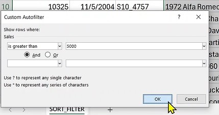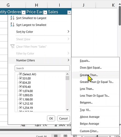 - Selanjutnya apabila kita ingin mencari baris yang salesnya melebihi 5000. Kita klik drop down di kolom Sales, pilih Number Filter lalu pilih opsi Greater Than…