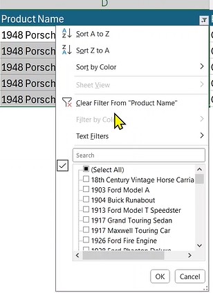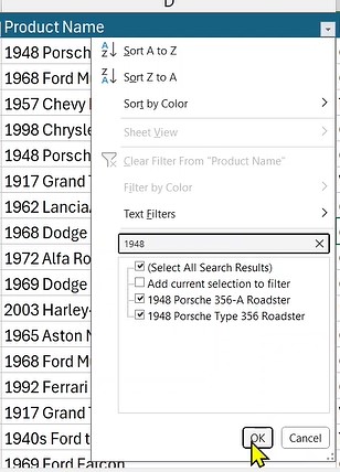 - Anda juga bisa menggunakan opsi Search untuk mencari nilai spesifik. Misalnya anda ingin mencari data yang mengandung kata “1948” dari kolom Product Name. Masukan kriterianya, klik OK.