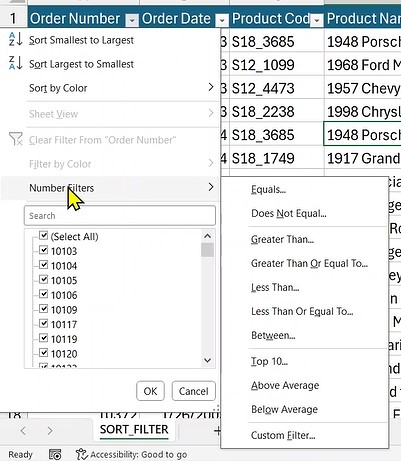 - Pada tombol drop down ini, akan muncul pilihan yang sesuai dengan tipe data di kolom tersebut. Untuk kolom Order Number, yang tampil adalah Number Filter, opsinya adalah sebagai berikut.