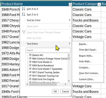 Lalu untuk kolom Product Name yang bertipe Text, yang tampil adalah Text Filters, opsinya adalah sebagai berikut
