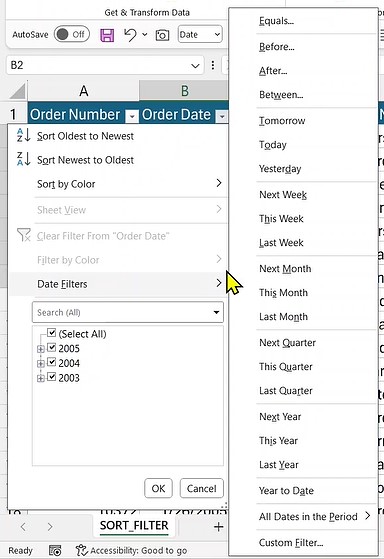 Untuk kolom Order Date, yang bertipe date atau tanggal, yang tampil adalah Date Filters, opsinya adalah sebagai berikut