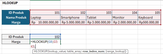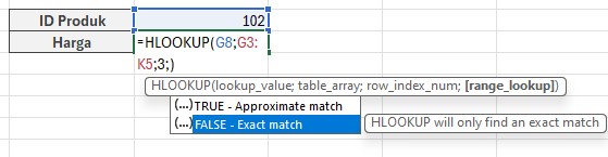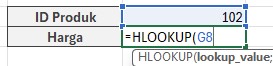 Pada table sebelah kanan, ID produk ada pada kolom G, H, I, dan seterusnya. Untuk table seperti ini, maka digunakan HLOOKUP.