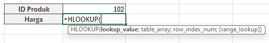 - Lalu tekan enter untuk mendapatkan nilai harga dengan ID Produk 102 berdasarkan rumus HLOOKUP.