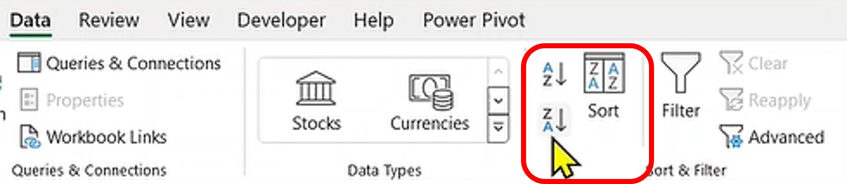 1. Untuk mengurutkan dari kecil ke besar, pilih tab Data, pada bagian Sort & Filter, pilih A-Z.