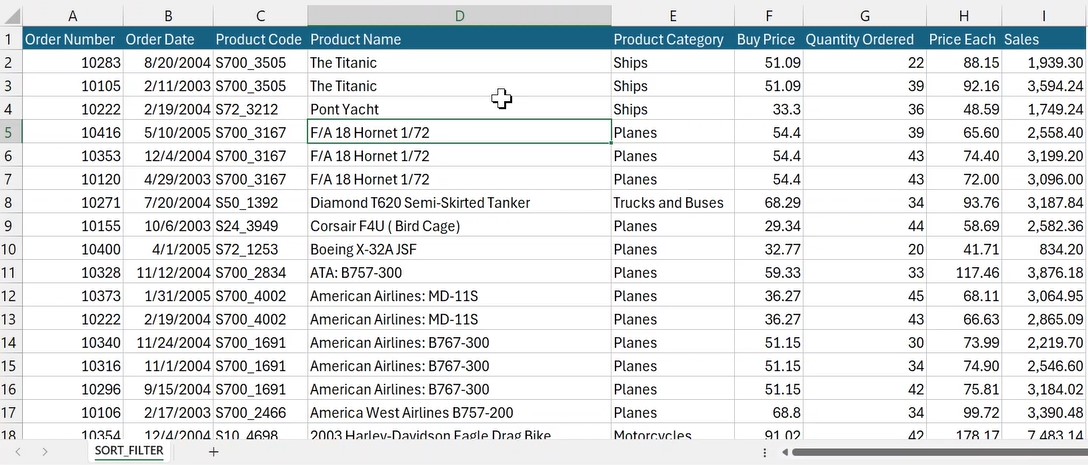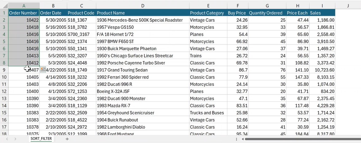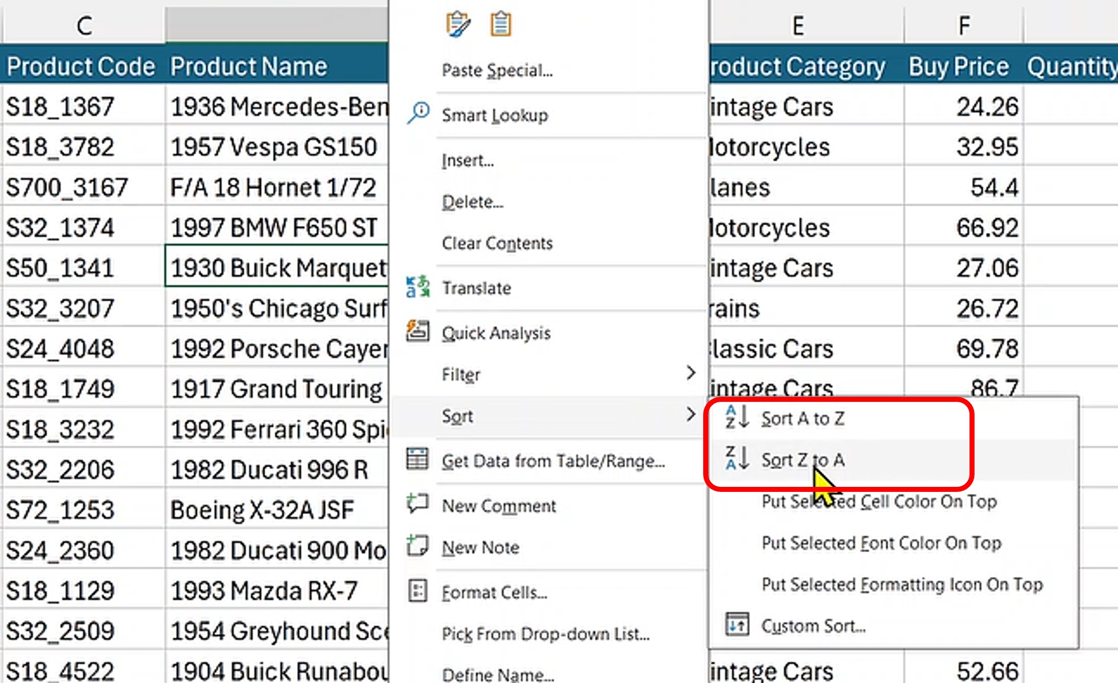 Begitu pula dengan kolom yang bertipe data teks seperti kolom Product Code dan Product Name, menu yang muncul adalah A-Z dan Z-A.