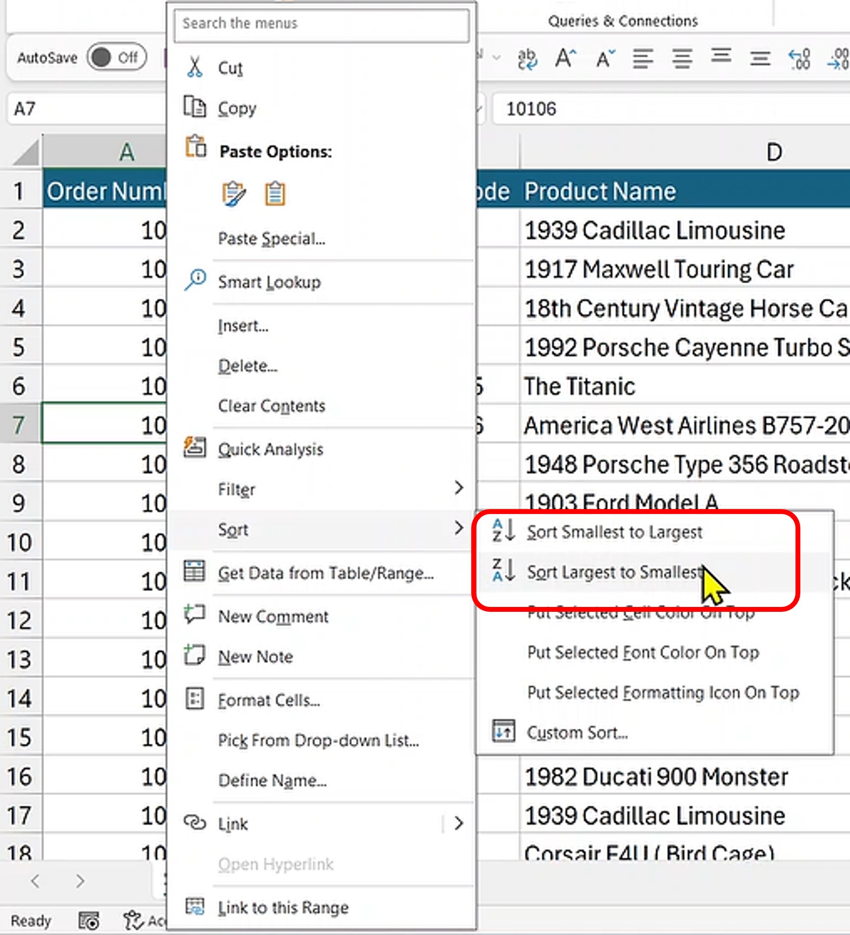 1. Klik kanan, pilih Sort, pilih Smallest to Largest, atau Largest to Smallest.