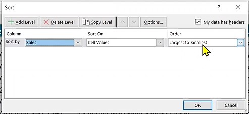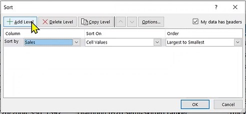 1. Pada kotak dialog yang muncul untuk level yang pertama masukan kriteria pertama, yaitu Sort by Sales, dan untuk Order masukkan Largest to Smallest.