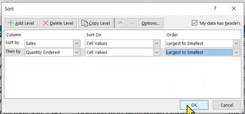 1. Masukan kriteria kedua, yaitu Then by Quantity Ordered, dan Order Largest to Smallest. Lalu klik OK.