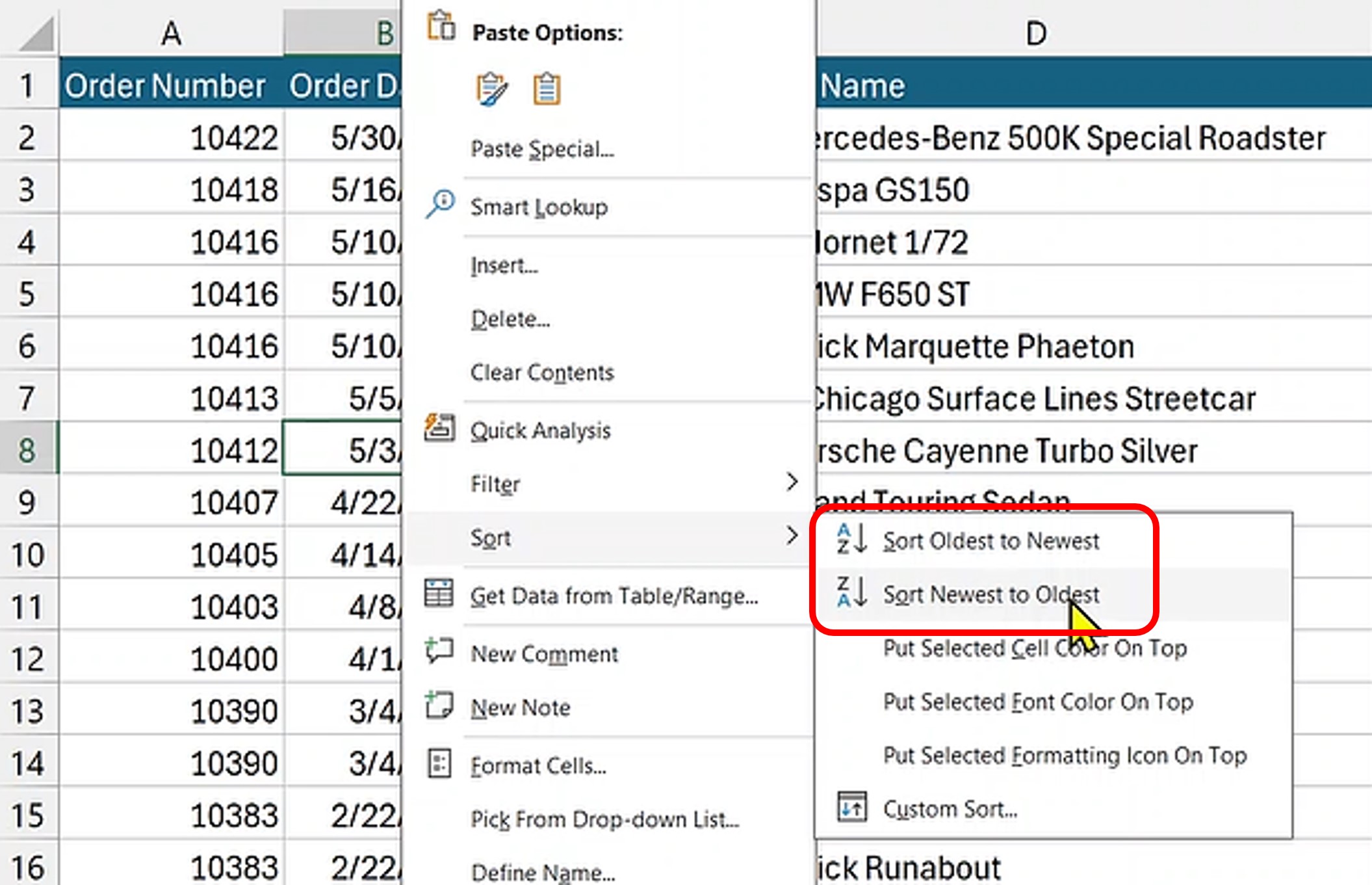 Tapi jika menggunakan klik kanan, kita bisa melihat perbedaanya. Untuk tipe data tanggal seperti ini, maka menu yang muncul adalah Oldest to Newest dan Newest to Oldest.