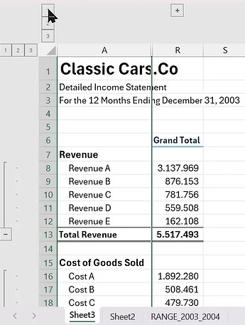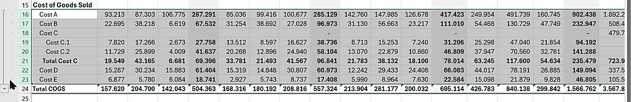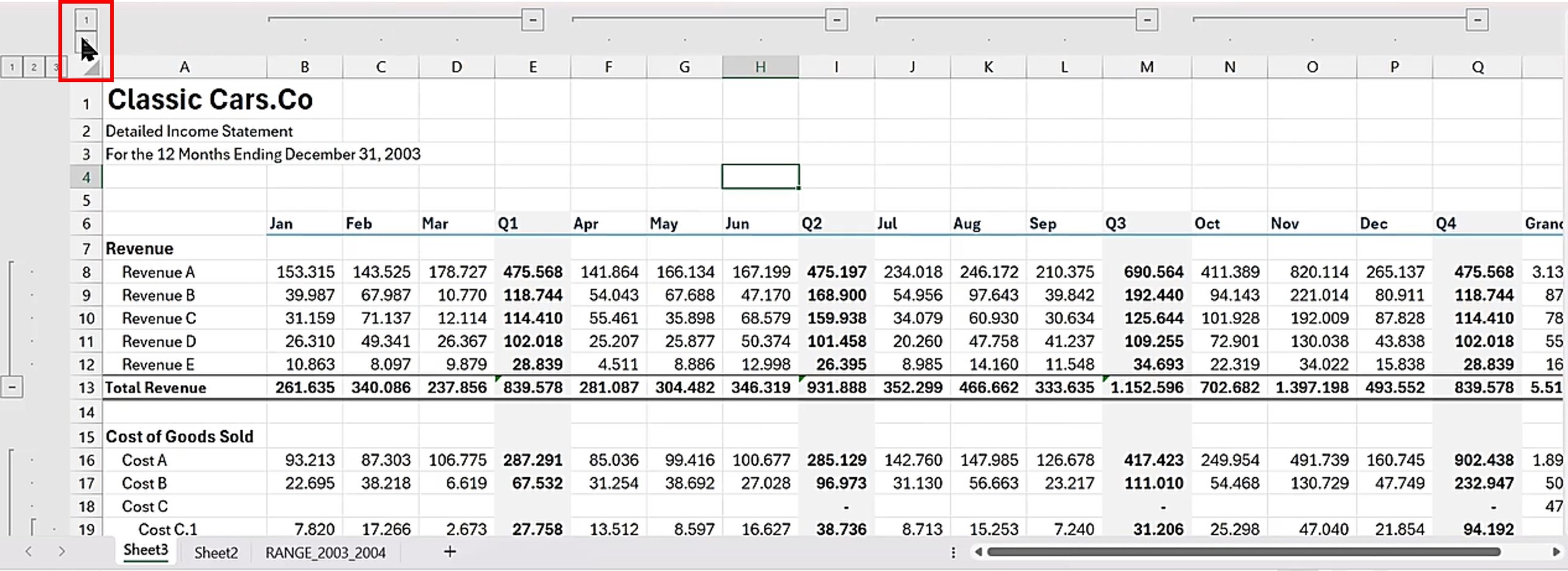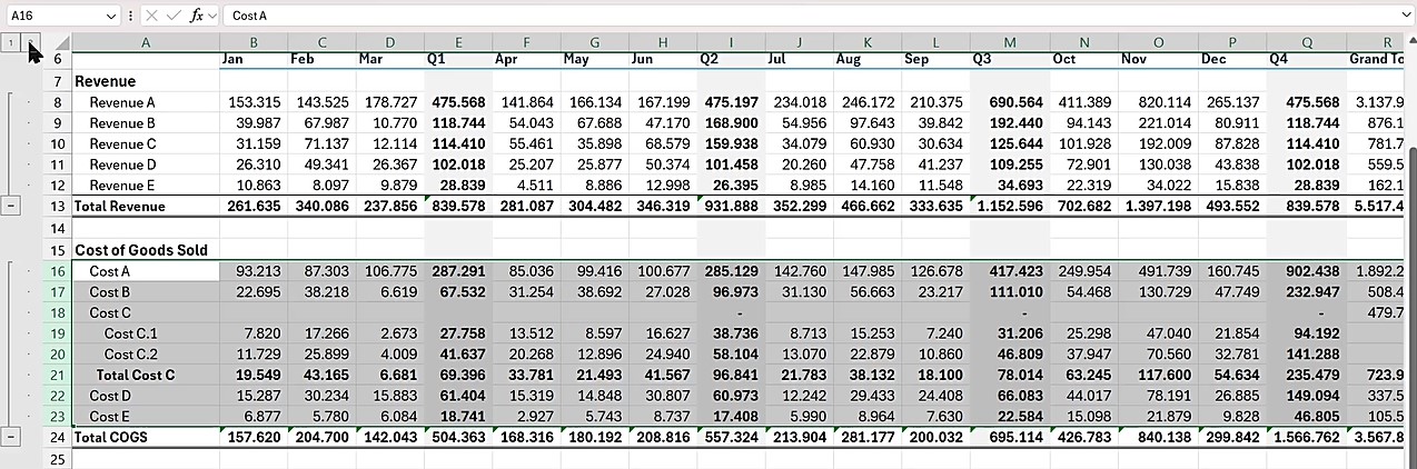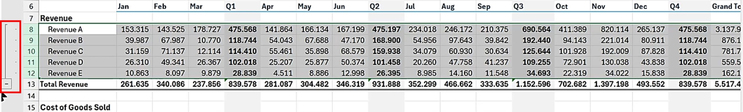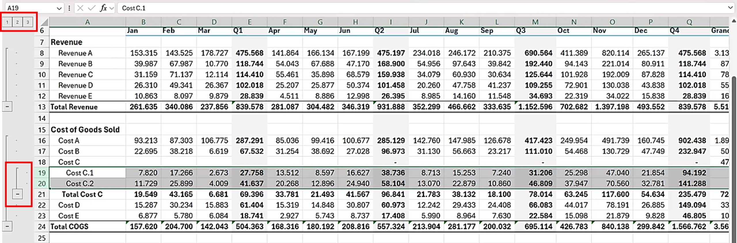 - Maka akan muncul tombol level 1-2 di atas yang dapat berfungsi bersamaan untuk menampilkan collapse dan expand kedua grup di bawahnya.