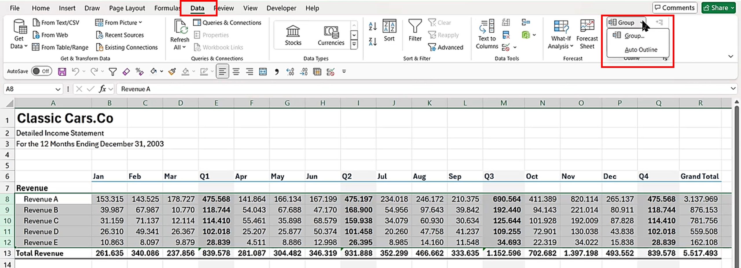 - Pilih baris 8 s/d 12, pilih tab Data pada bagian Outline klik Group.