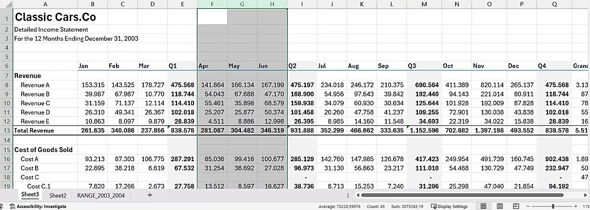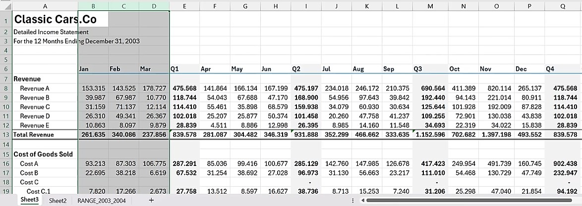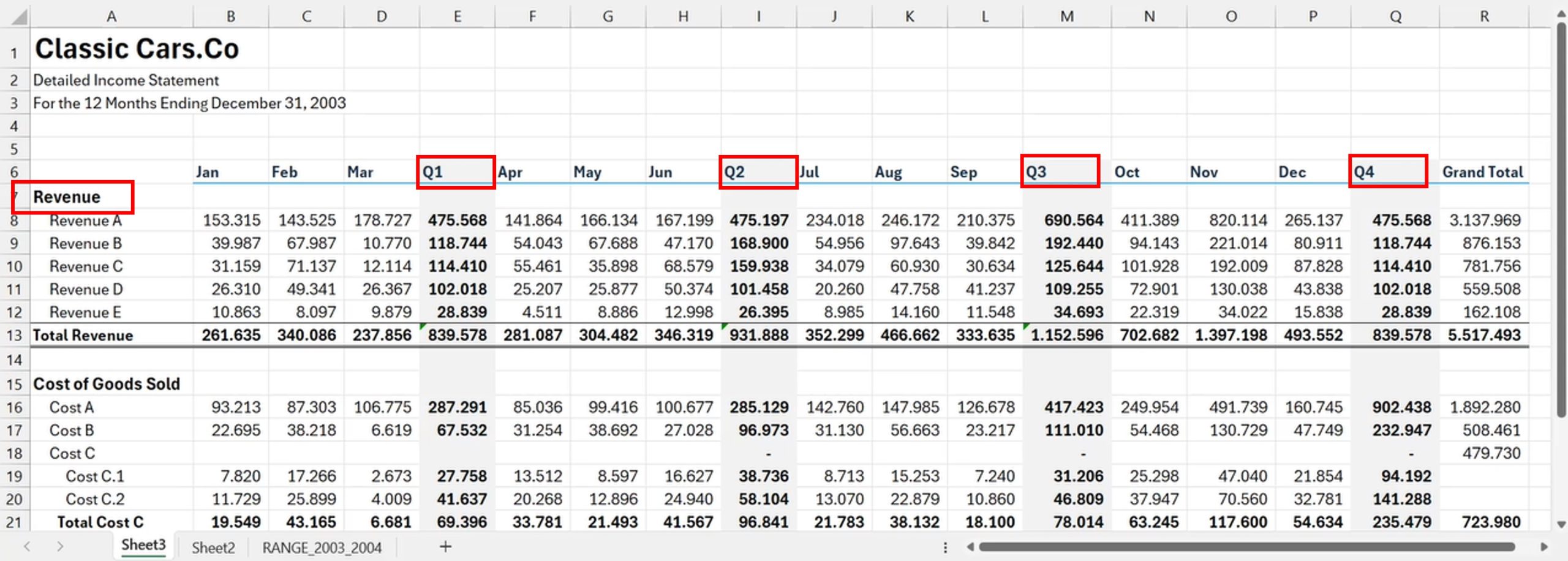 Untuk revenue gruping dilakukan berdasarkan baris dan untuk kuartal berdasarkan kolom.