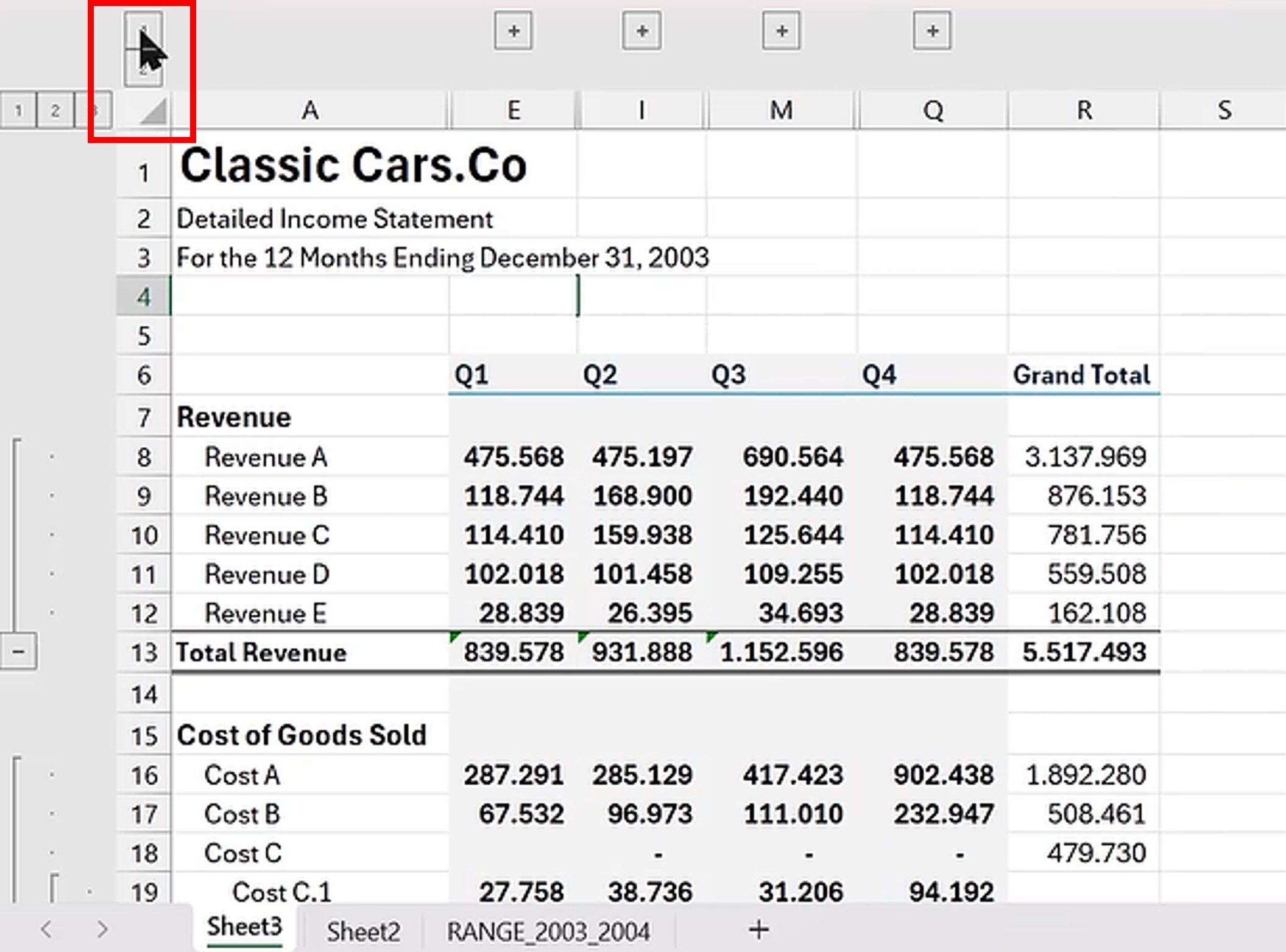- Maka akan muncul tampilan “–“ dan “+” di samping kiri tabel. Tanda tersebut digunakan untuk hide/unhide atua collapse/expand baris 8-12 tersebut.