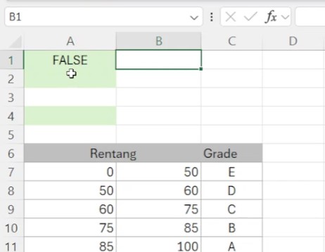 Pada contoh kasus training excel berikut ini, kita akan menggunakan kedua fungsi tersebut secara bersarang (nested) untuk menentukan grading dari sebuah nilai. Misalnya kita masukan nilai 65 pada B13.
