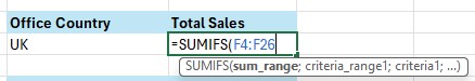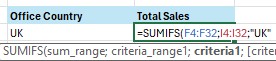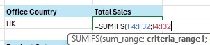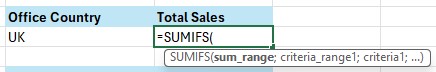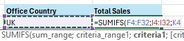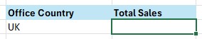 - Contoh pertama, kita akan menjumlahkan sales dengan kriteria Office Country UK.