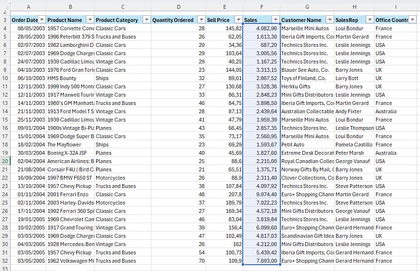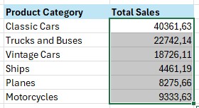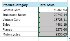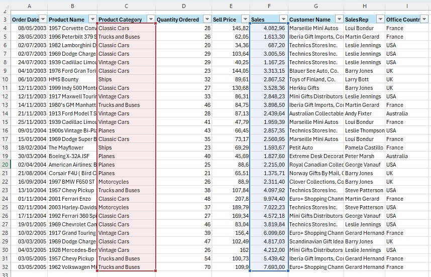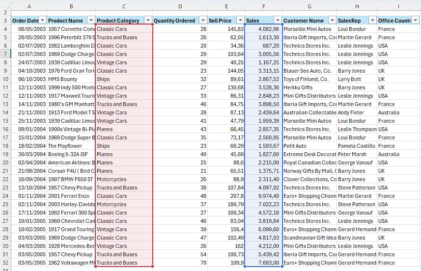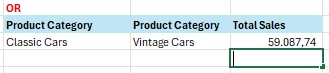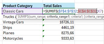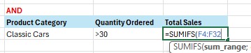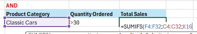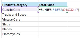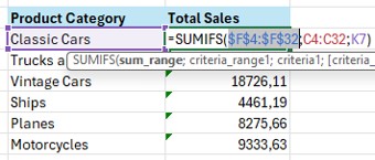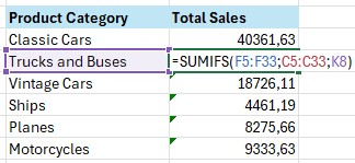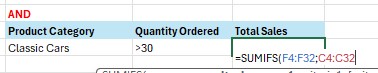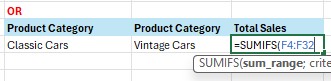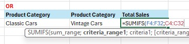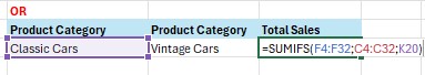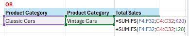 Contoh berikutnya, kita akan menggunakan fungsi SUMIFS untuk dua kriteria sekaligus dengan menggunakan logika OR. Di mana yang dicari adalah product category classic cars OR product category vintage cars.