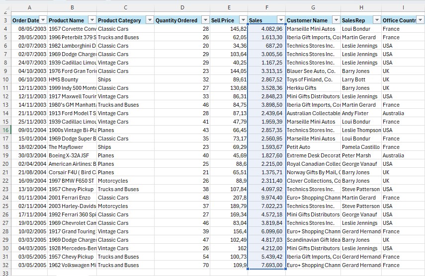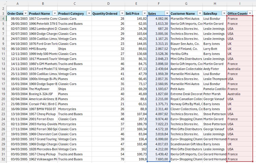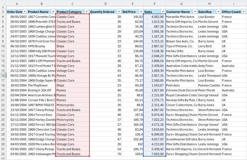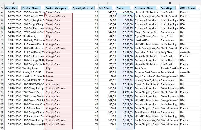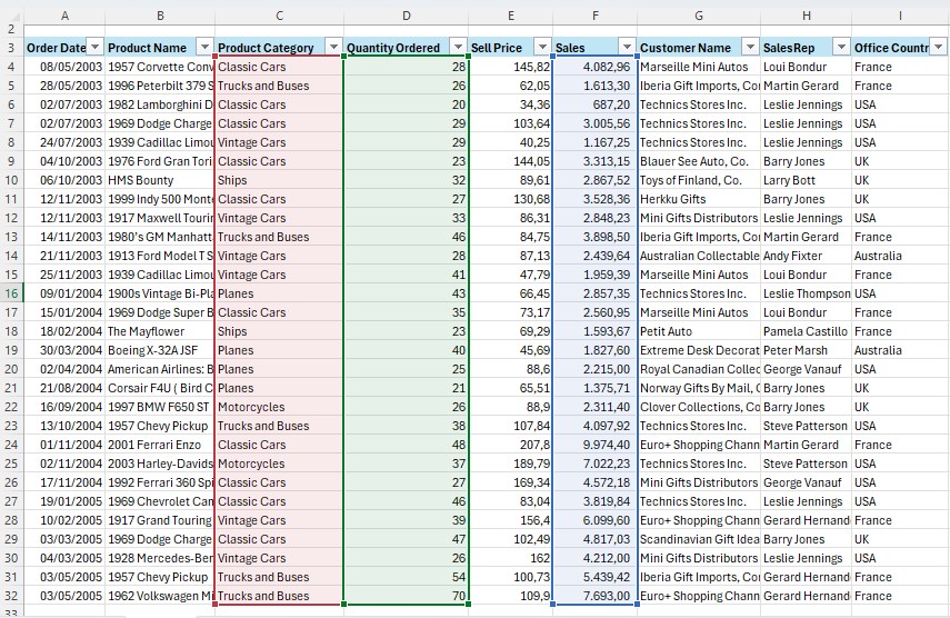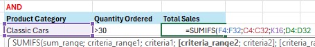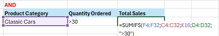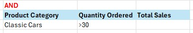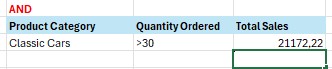 Dalam hal ini, kita akan menggunakan logika AND, di mana yang dicari adalah untuk product category classic cars dan sekaligus quantity order >30.