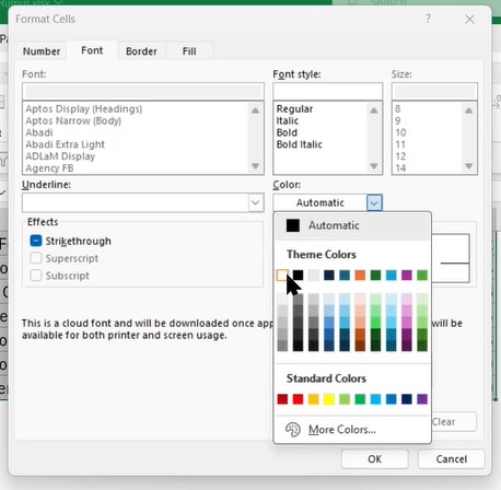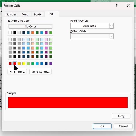 - Pada kotak dialog yang muncul kita dapat menentukan untuk memilih warna merah untuk Fill dan warna putih untuk Font. Kemudian klik OK.