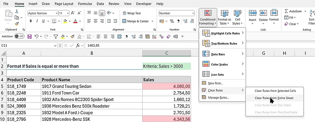 - Pertama, hapus terlebih dahulu Conditional Formatting yang telah diterapkan dengan cara klik tab Home, klik Conditional Formatting, lalu Clear Rules dan pilih Clear Rules from Entire Sheet.