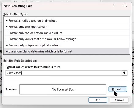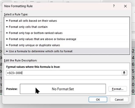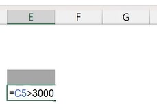 - Lalu masukkan rumus =C5>3000 yang disimpan terlebih dahulu di E5.