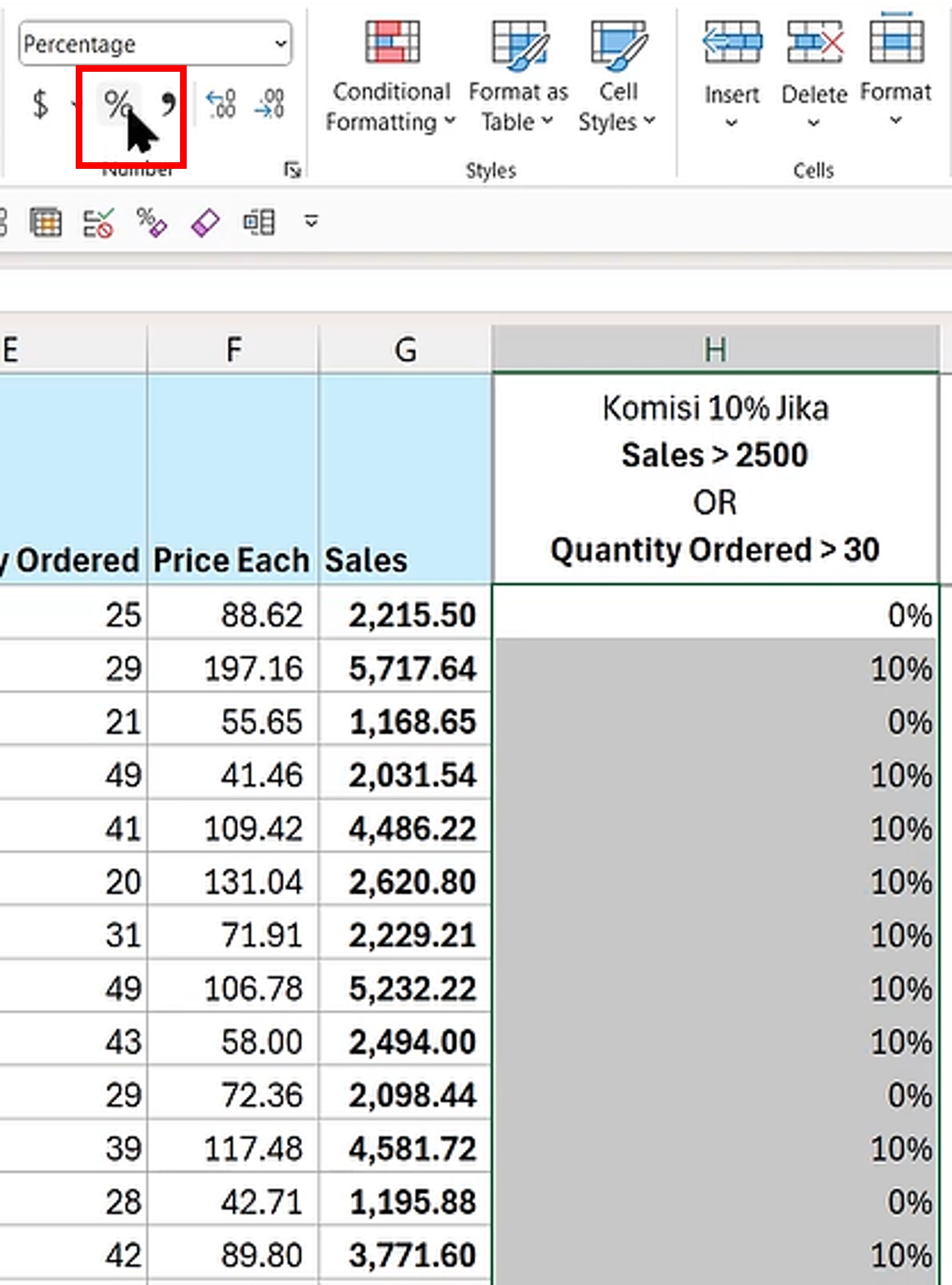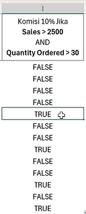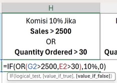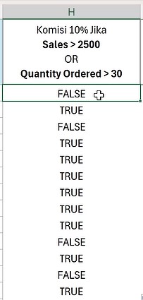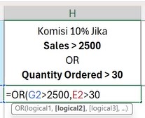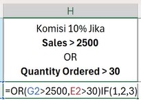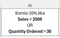 2. Pada file latihan, bisa kita lihat di H1, bahwa komisi 10% akan diberikan jika Sales > 2500 atau Quantity Order > 30.
