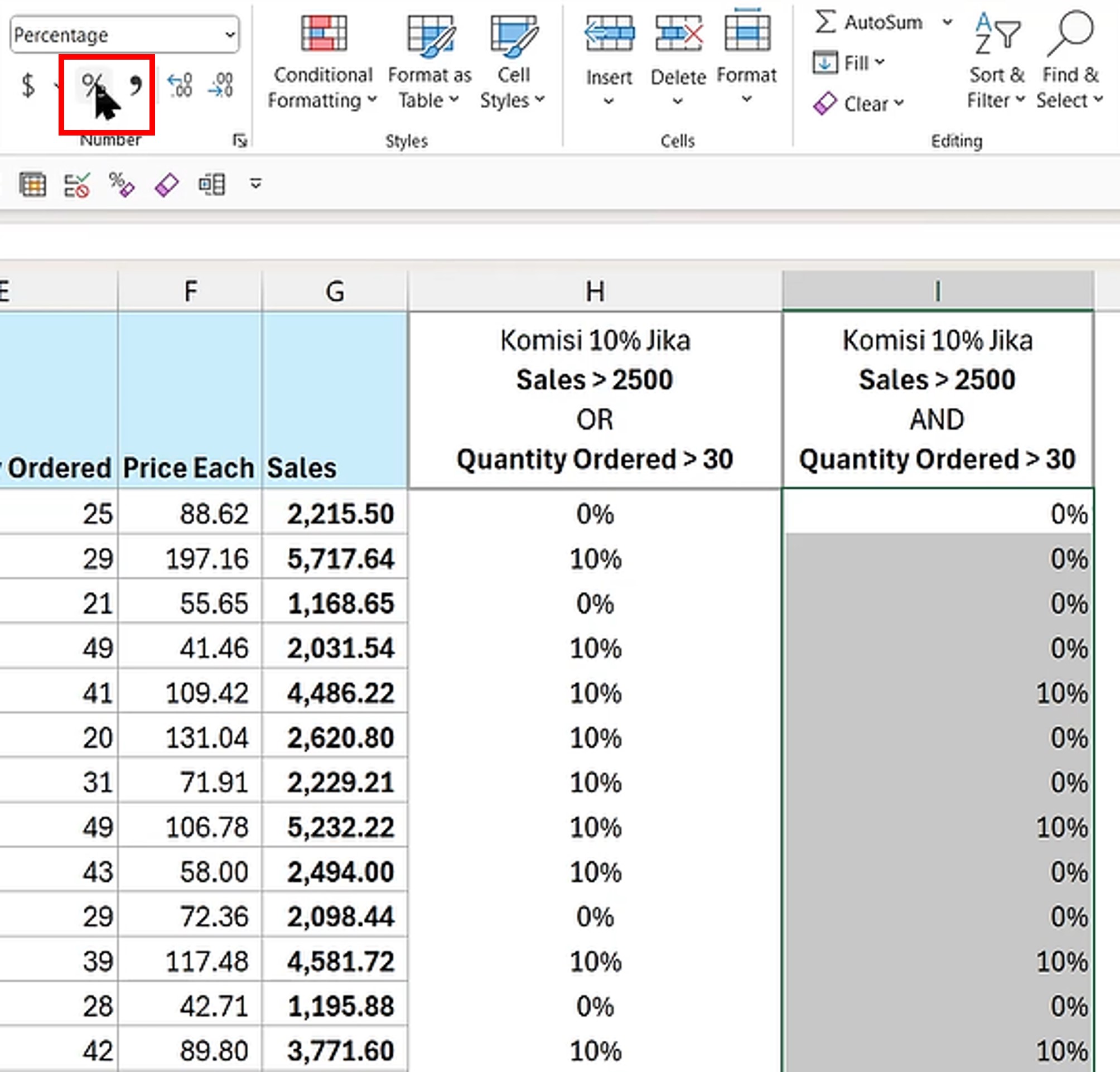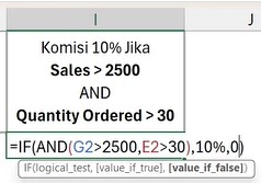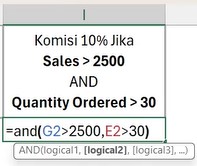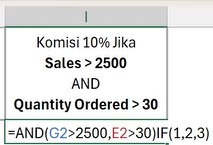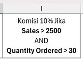 1. Untuk kasus kedua, komisi akan diberikan jika Sales > 2500 dan Quantity Ordered > 30.