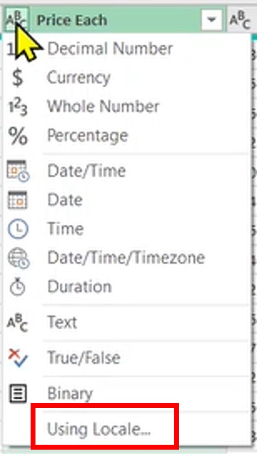 - Lalu untuk mengubah format currency, klik kolom Price Each lalu klik Using Locale..