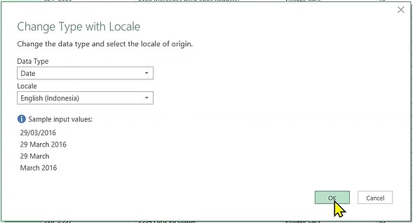 - Kemudian pada kotak dialog yang muncul ubah Data Type menjadi Date dan Locale menjadi English (Indonesia).