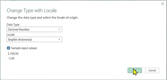 - Pada kotak dialog yang muncul, untuk Data Type pilih Decimal Number dan Locale pilih English (Indonesia).