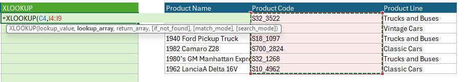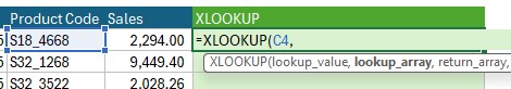 - Pertama, masukkan rumus XLOOKUP, lalu untuk lookup_value nya ambil dari product code.